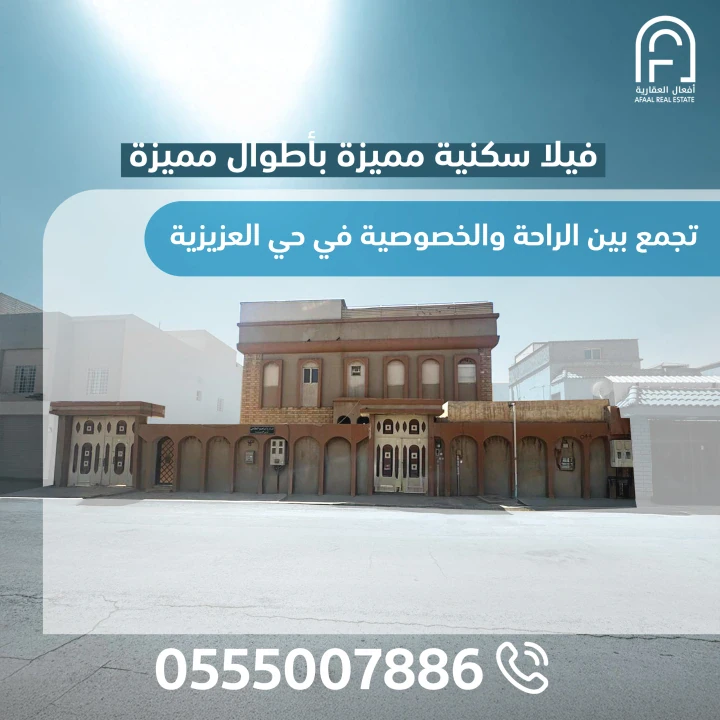 فيلا سكنية مميزة بحي العزيزية على مساحة 472.5 م²، بتصميم عصري يجمع بين الراحة والخصوصية. تتكون من دورين مفصولة، وكل دور يضم: – 5 غرف نوم – مطبخ مجهّز – صالة واسعة – 3 دورات مياه كما يتوفر ملحق علوي يحتوي على غرفتين بدورة مياه، إضافة إلى مطبخ جانبي خارجي يلبي احتياجات الضيافة. ويضم الملحق الخارجي دورة مياه مستقلة، مما يضيف مرونة في الاستخدام. فيلا متكاملة بتوزيع مريح وتصميم حديث، تمنحك تجربة سكن راقية في موقع استراتيجي داخل حي العزيزية